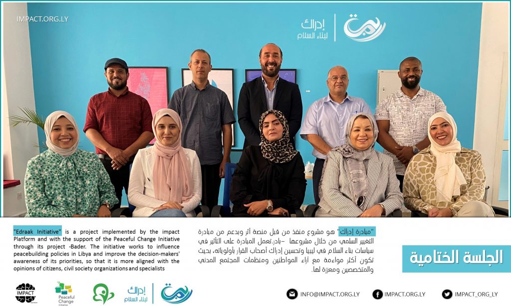 عملنا طيلة فترة تنفيذ الميادرة على تقريب وجهات النظر بين أصحاب القرار والقيادات الشبابية ومنظمات المجتمع المدني والمتخصصين حول أولويات بناء السلام في ليبيا وتعزيز إدراك أصحاب القرار بأهمية مشاركة منظمات المجتمع المدني والأكاديمين في وضع الاستراتيجيات المتعلقة بها، ليجعلها أكثر مرونة ويخلق شبكة داعمة من المجتمع المدني لاستراتيجية الحكومة في بناء السلام، فعملية مشاركة المجتمع المدني في وضع السياسات سيجعله يشعر بإلتزام اتجاه دعم عملية السلام في ليبيا.