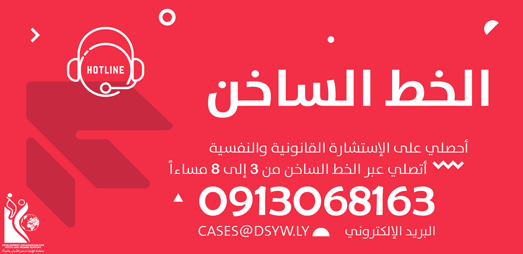 خدمة الخط الساخن لتقديم الرعاية النفسية والإجتماعية للمعنفات على الرقم : 0913068163 أو عبر البريد الإلكتروني : Cases@dsyw.ly